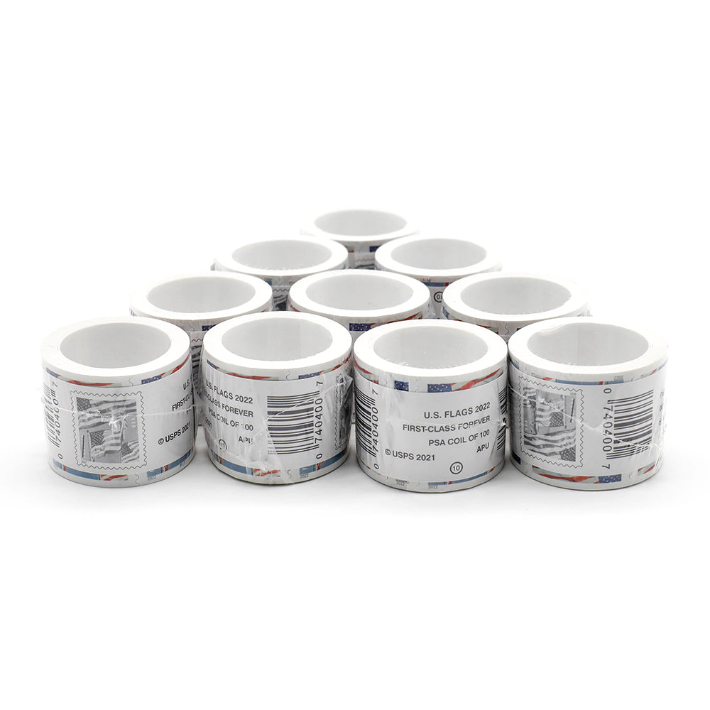 Brand new roll of 100 U.S. Flag 2022 Forever stamps. Originally issued by the post office on January 9, 2022. The stamp art is a painting of three flags in a circular formation, reminiscent of the 50 flags encircling the Washington Monument. The artist used three separate photographs of the same flag taken seconds apart as reference and stitched together the images into a single composition. Laura Stutzman was the stamp designer and illustrator. Ethel Kessler was the art director.